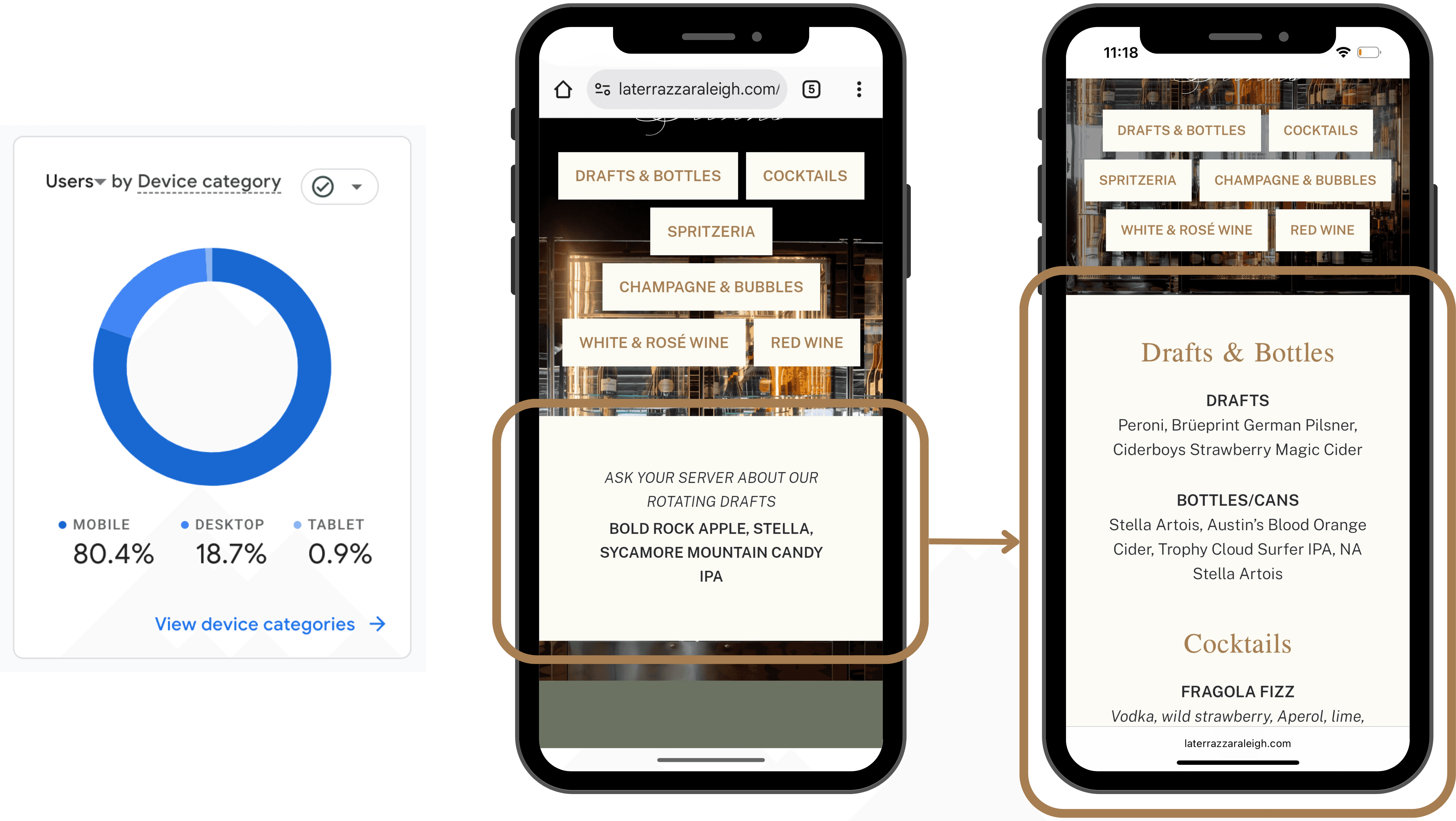 After launch, analytics showed that 80% of visitors accessed the site on mobile, validating the mobile-first design approach. Based on ongoing user behavior and feedback, I further refined the mobile experience, including a recent update to the drinks page to enhance content organization and usability on smaller screens.
